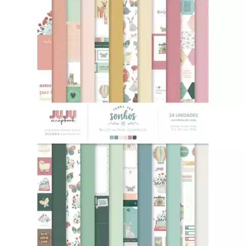Bloco tamanho A4 com papéis coordenados com estampas da coleção Terra dos Sonhos da Juju Scrapbook.