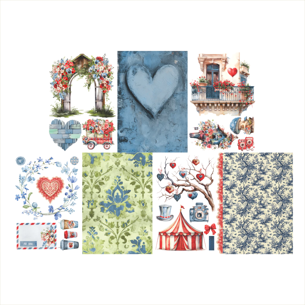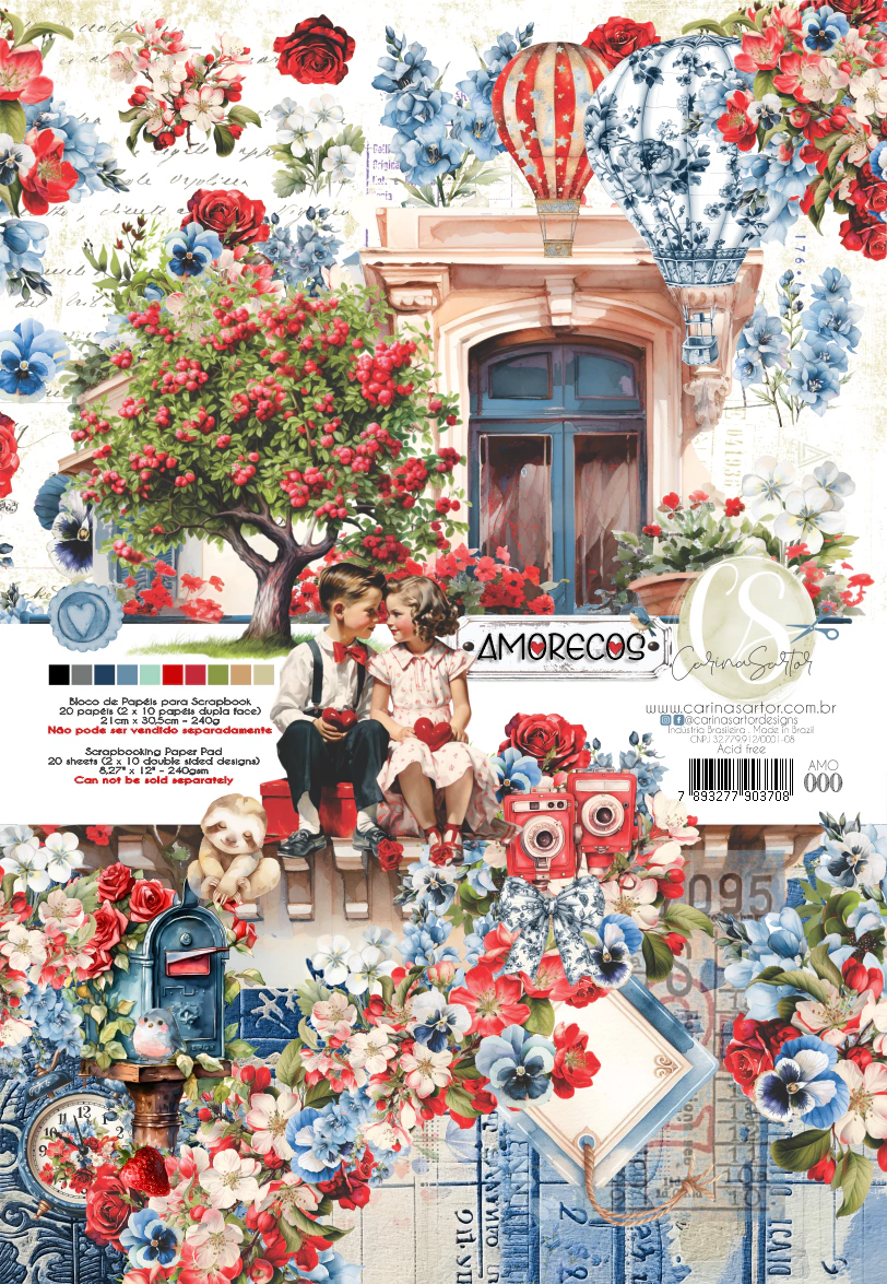 Bloco tamanho A5 com papéis coordenados com estampas da coleção Amorecos da Carina Sartor.